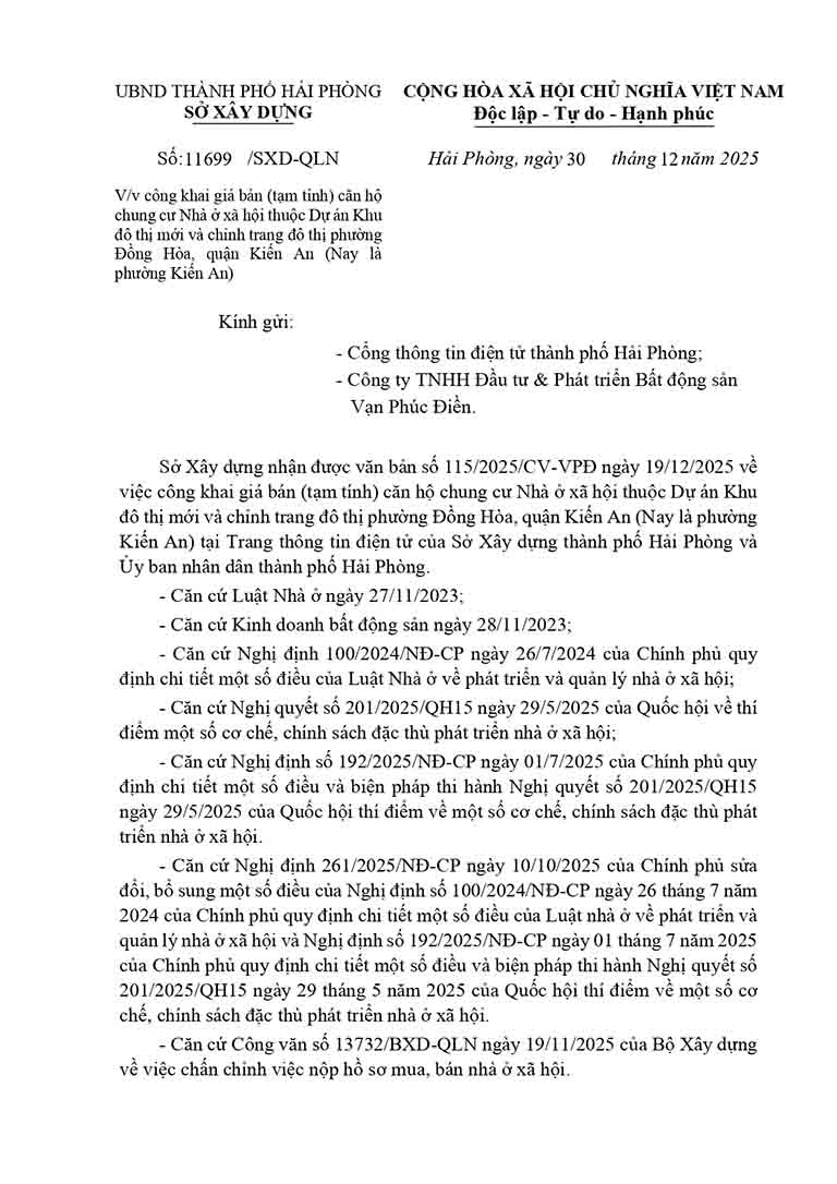 Văn bản số 11699/SXD-QLN là một lời khẳng định cho cam kết của chính quyền Hải Phòng trong việc hỗ trợ người dân tiếp cận nhà ở. Với mức giá tạm tính khoảng 19,3 triệu đồng/m², dự án tại phường Kiến An của chủ đầu tư Vạn Phúc Điền hứa hẹn sẽ là tâm điểm chú ý của thị trường trong thời gian tới.
